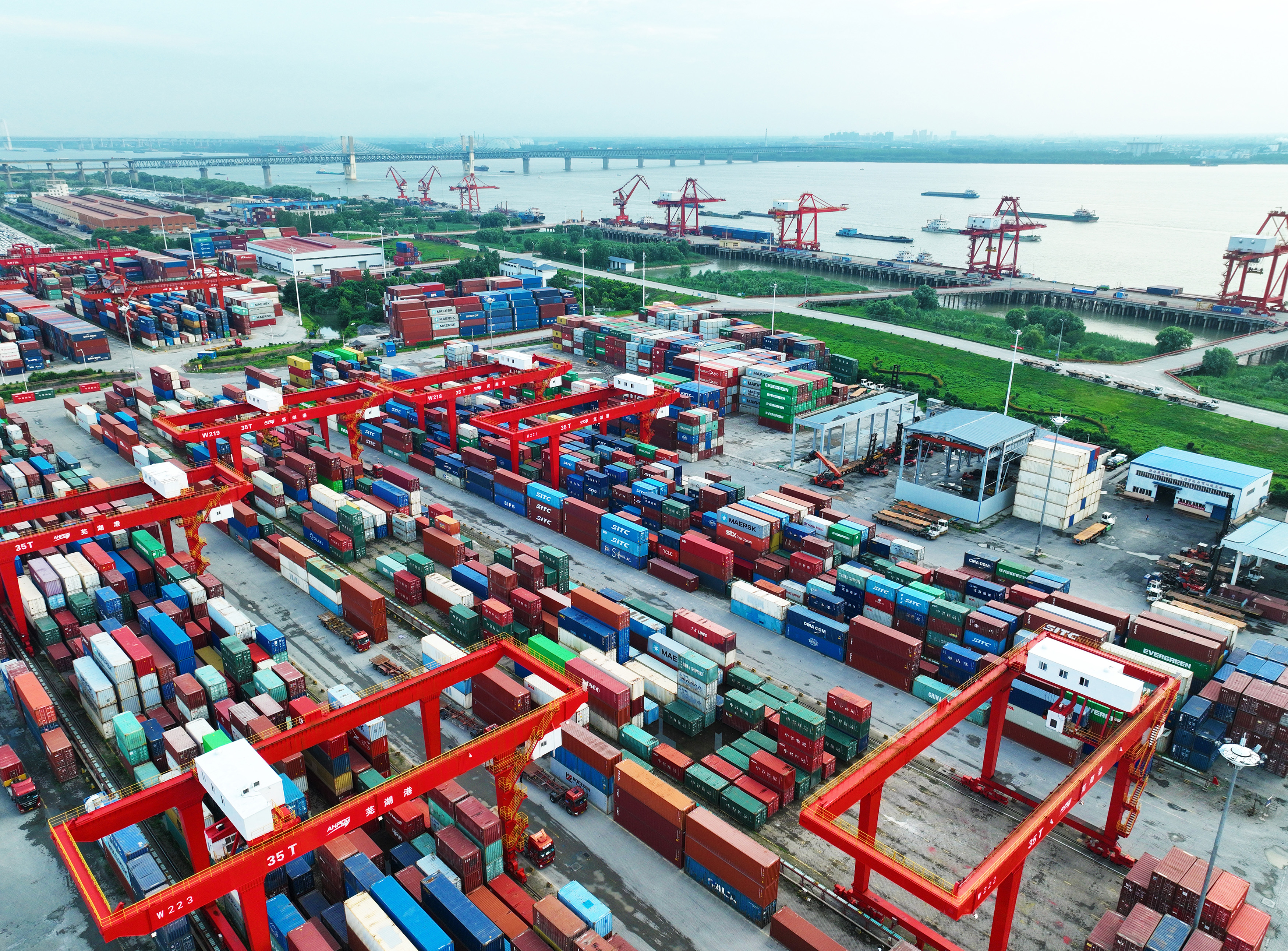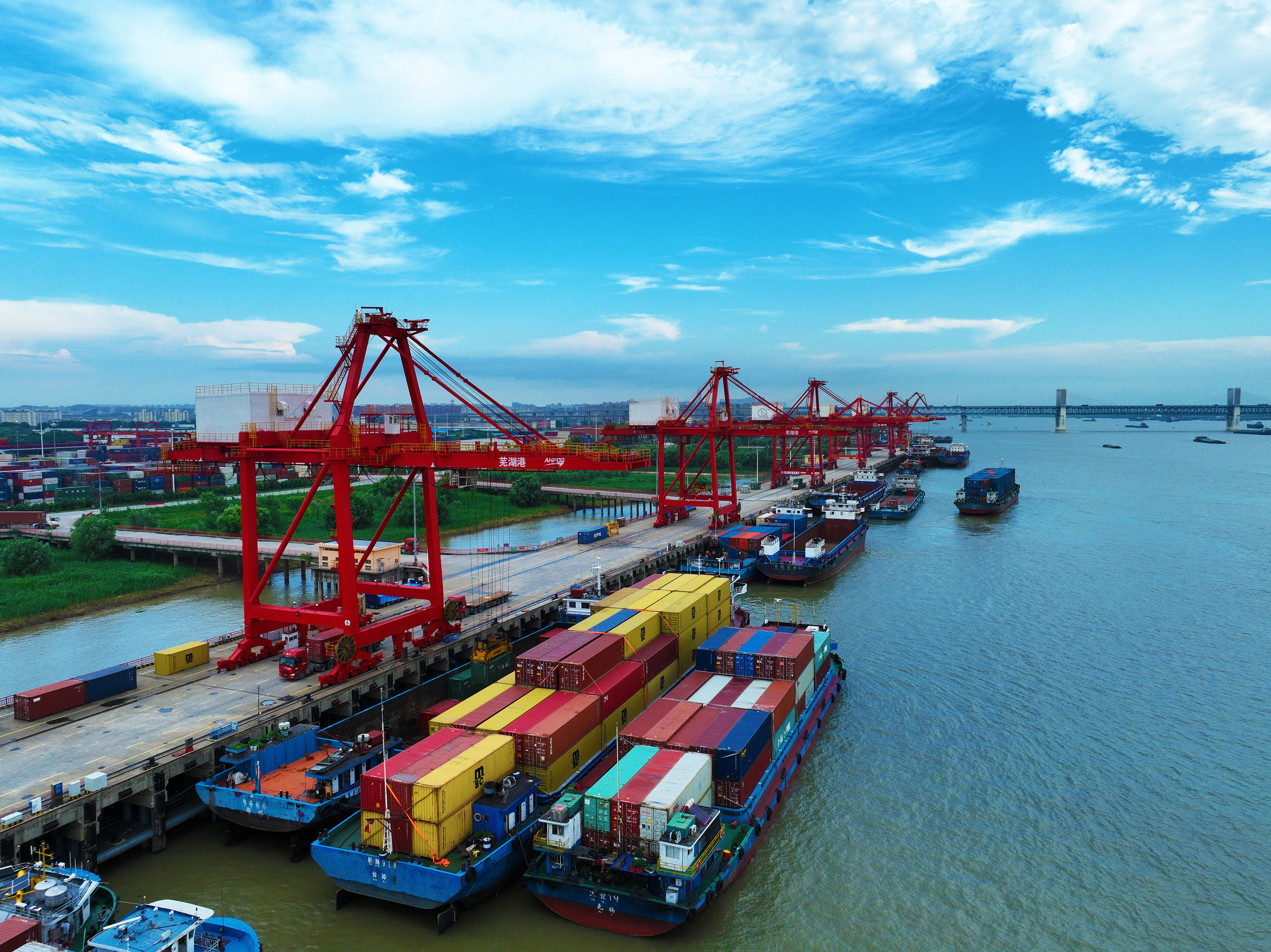 2023年7月17日,安徽港口蕪湖港朱家橋港區(qū)國(guó)際集裝箱碼頭,貨輪正在進(jìn)行集裝箱裝卸作業(yè)(無(wú)人機(jī)照片)。
