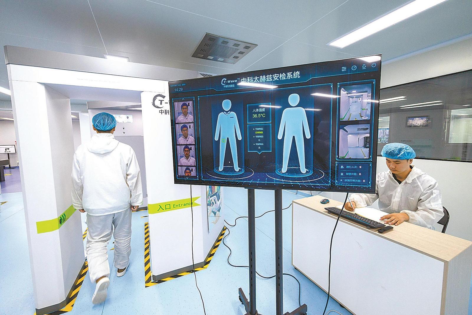 8月14日,在合肥廬陽經濟開發區中科大校友創新園安徽中科太赫茲科技有限公司,技術人員正在調試自主研發的“太赫茲激光主動成像安檢設備”。趙明 攝