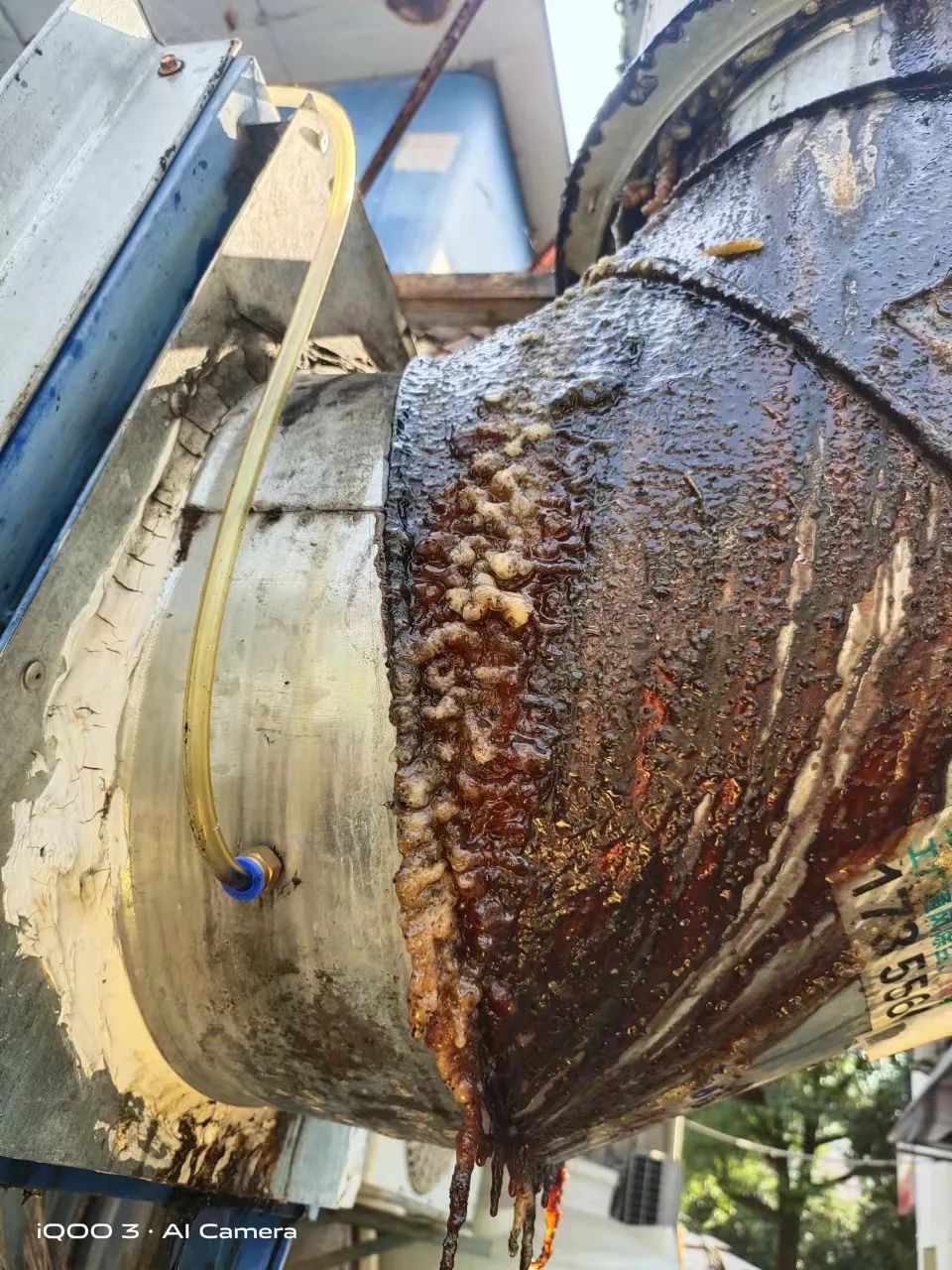 在淮河西路與蒙城路交口西北角的杏香園酒樓樓頂,幾臺油煙監測設備正在運行,根據顯示屏數據顯示,油煙濃度、顆粒物濃度和非甲烷總烴數值均為0mg/m³。在油煙在線監測設備下方地面,已經被從油煙管道滲漏出的油漬污染一大片。記者用木棍粗略地估測了一下,地面的油漬已有約1厘米厚,當記者欲將木棍拿走時,發現濃厚的油漬已經呈現“拉絲”狀。