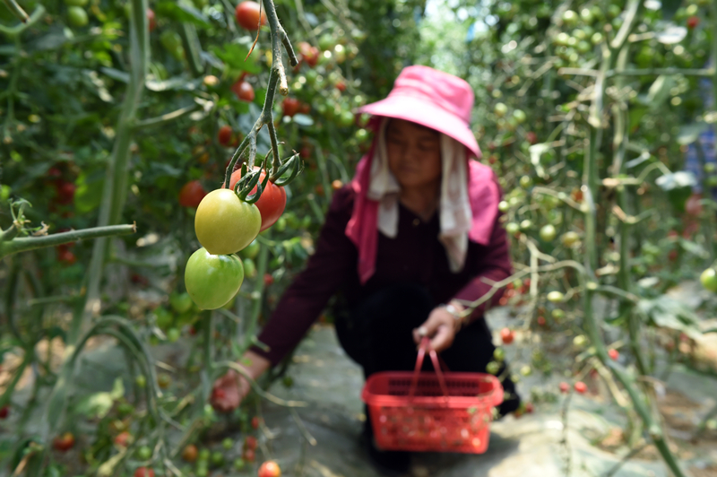 安徽農業大學江淮分水嶺綜合試驗站綠色蔬菜示范基地,農戶在番茄大棚里勞作。新華社發(周牧 攝)