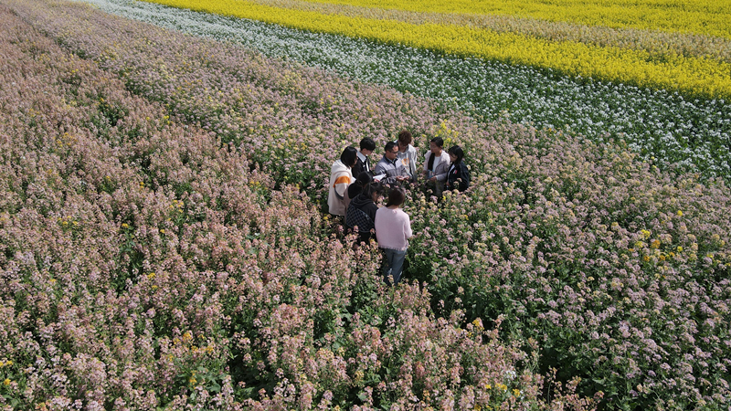 安徽農業大學農學院教師在給學生講解油菜開發利用的相關知識(無人機照片)。新華社記者 張端 攝