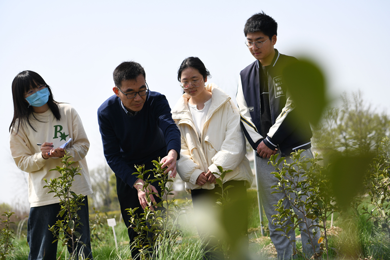 在皖中綜合試驗站內,安徽農業大學茶樹生物學與資源利用國家重點實驗室常務副主任韋朝領(左二)在給學生講解茶樹新品種選育的相關知識。新華社記者 張端 攝