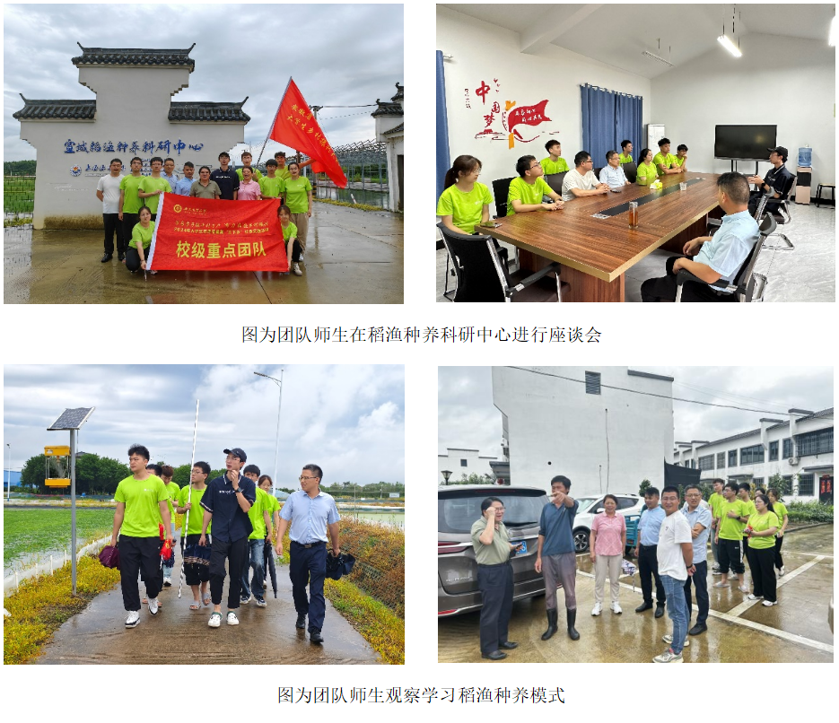 7月14日上午,實(shí)踐團(tuán)隊(duì)的師生們先后來到了宣城市上海海洋大學(xué)洪林科研基地和宣城區(qū)沈村鎮(zhèn)勝利村的千畝連片稻蝦共生種養(yǎng)區(qū),以了解宣城市當(dāng)?shù)氐疚r綜合種養(yǎng)應(yīng)用現(xiàn)狀,探討?zhàn)B殖模式與技術(shù),尋求新的突破?;刎?fù)責(zé)人周旋向團(tuán)隊(duì)成員們介紹“蝦稻蝦”模式基本情況、羅氏沼蝦生長(zhǎng)情況、老頭蟹養(yǎng)殖與銷售等生產(chǎn)作業(yè)情況。沈村鎮(zhèn)勝利村的孫玉勝也介紹了這幾年稻蝦養(yǎng)殖狀況,同團(tuán)隊(duì)成員進(jìn)行交流探討,深入了解了當(dāng)?shù)仞B(yǎng)殖戶的蝦稻綜合種養(yǎng)模式,實(shí)現(xiàn)了“一田兩用、一地雙收”,為水產(chǎn)養(yǎng)殖及鄉(xiāng)村振興的發(fā)展注入了新的活力。