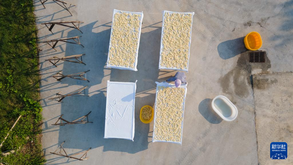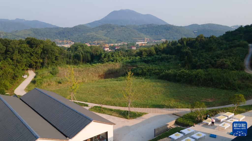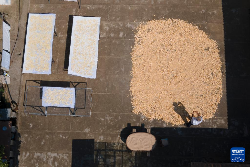 8月31日,在安徽省銅陵市郊區大通鎮大院村山禮白姜工坊門前,工作人員在晾曬白姜(無人機照片)。新華社記者 張端 攝