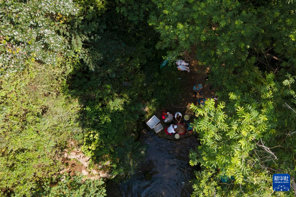 9月1日,在安徽省銅陵市郊區大通鎮大院村,村民準備進入姜田采收銅陵白姜(無人機照片)。新華社記者 張端 攝