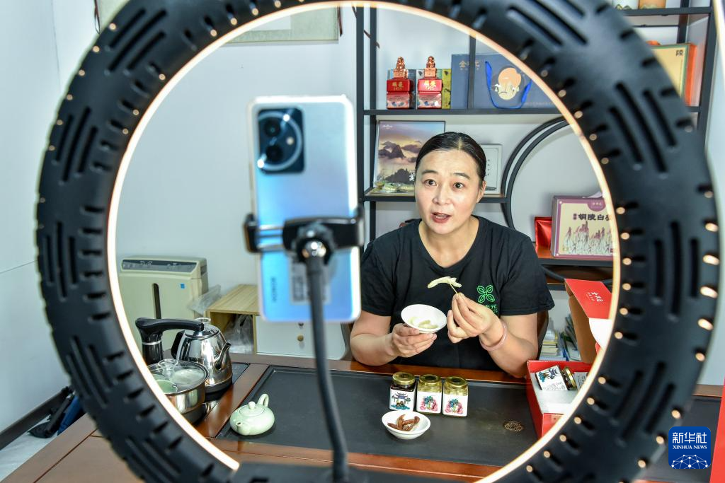 9月6日,在安徽省銅陵市一家電商企業,工作人員在線上推介銷售銅陵白姜。新華社發(儲著傳 攝)