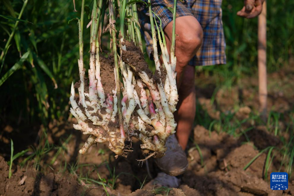 8月25日,在安徽省銅陵市義安區天門鎮新華村,村民朱樹清展示采收的銅陵白姜。新華社記者 張端 攝