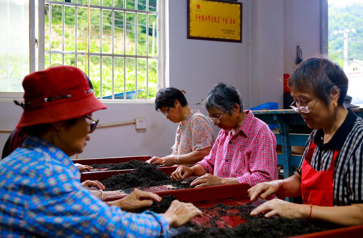 在這個群山環(huán)抱的小村里,吳旺林和他的紅茶廠是鄉(xiāng)親們最信賴的“錢袋子”。村里年輕人大多外出務工,留守的婦女們成了茶廠的主力軍。車間的分揀區(qū),木板上的祁門紅茶色澤烏潤,散發(fā)著獨特的蜜香。早飯過后,上十位大姐正圍坐在一起,手指麻利地撿拾著干茶里的碎末、雜枝。“年紀大了,在‘家門口’干活,一天能掙百八十塊,還能照顧家里,真好!”60歲的孫敦蓮笑著說。