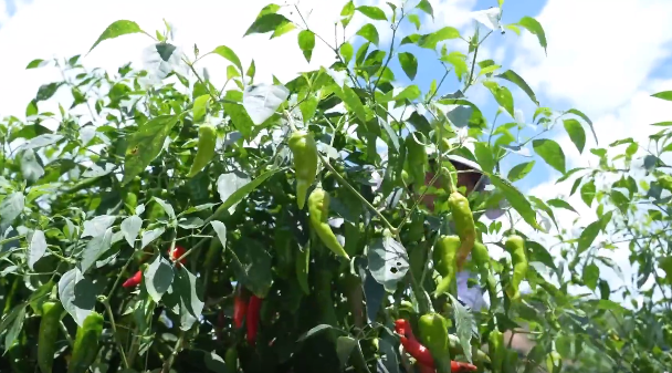 當地村民告訴筆者,獨特的高山氣候和土壤條件,孕育出的辣椒肉質脆嫩、辣中回甜,深受市場青睞。通過多茬采摘,辣椒的收獲期可持續到中秋節左右?!斑@個辣椒的口感,帶一點辣味,條形比較好,皮也比較薄,肉也比較脆?!笔Y勝取笑著說道,“吃起來有一點微甜,可以做辣椒醬、腌辣椒、干辣椒。”