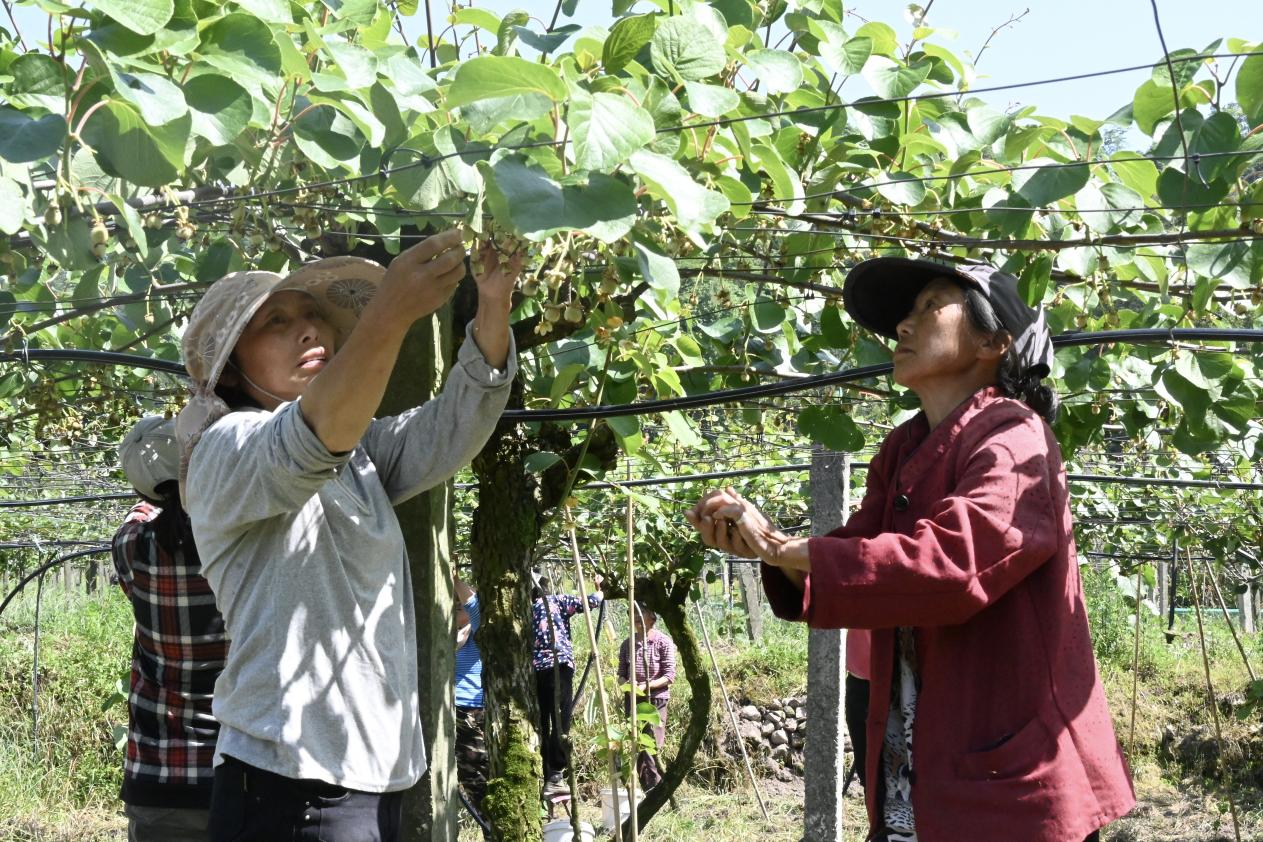 村民們根據每棵果樹的掛果情況,摘除生長密集的擁擠果、小果、殘果、病果等,在每個枝頭上保留個頭較大、生長健壯的獼猴桃果子。同時摘除樹枝上徒長的枝條、多余的葉片,保障健康的果子充分接受養分,不斷提高優質果率。