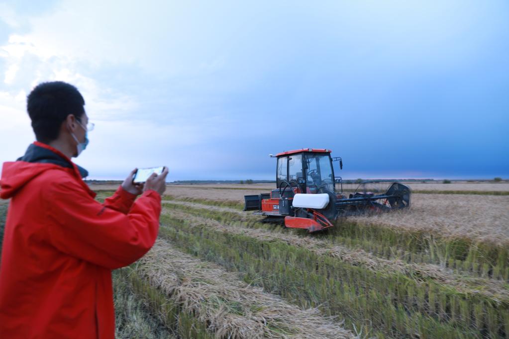 北大荒集團洪河農場有限公司的技術人員正使用手機操控無人駕駛收割機。(受訪者供圖)