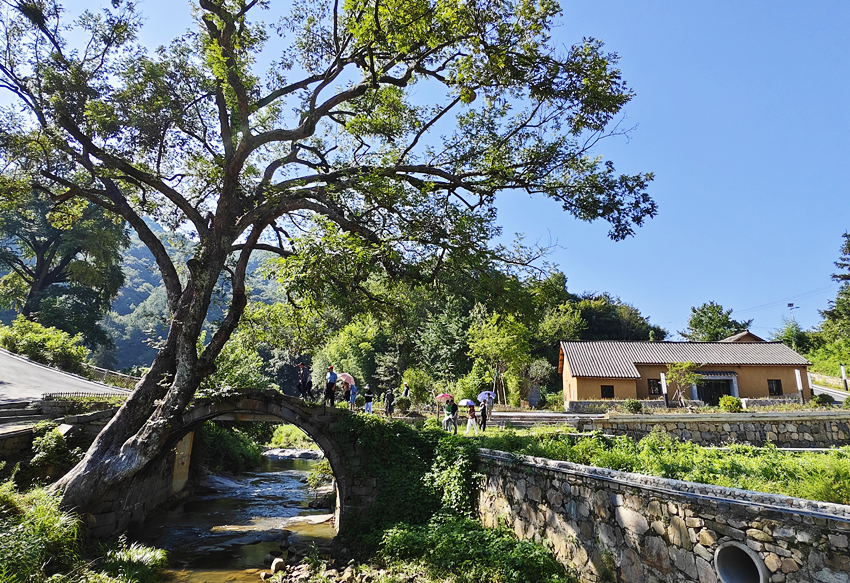 游客在霍山縣漫水河鎮(zhèn)古橋人家民宿前游覽。新華社記者 郭晨 攝