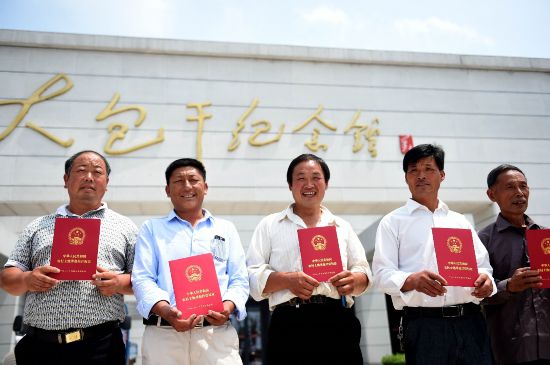 2015年7月8日,安徽省農村土地承包經營權確權登記首批頒證啟動儀式在鳳陽縣小崗村舉行,10多戶村民領到了《農村土地承包經營權證》。新華社記者 劉軍喜 攝