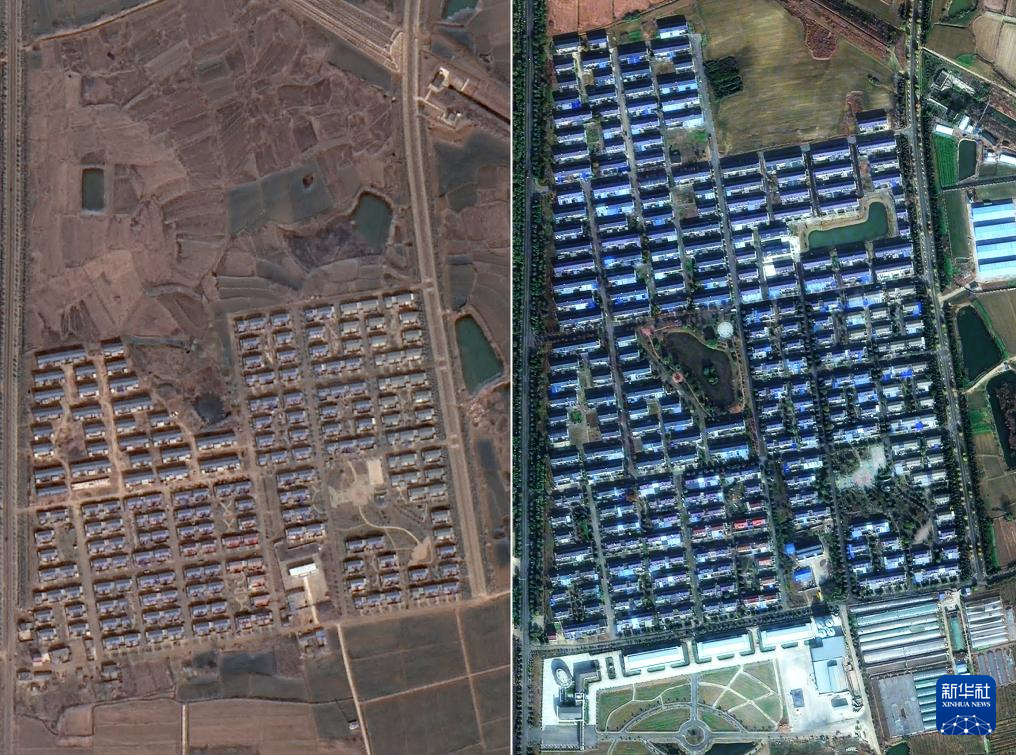 拼版照片:左圖為2015年3月衛星記錄的小崗村石馬新區早期景象;右圖為2023年11月衛星記錄的小崗村石馬新區,道路等基礎設施更加完善。新華社發(高分辨率對地觀測系統安徽數據與應用中心供圖)
