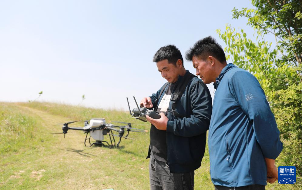 小崗村種糧大戶程夕兵(右)和女婿周地帥操作無人機給水稻施肥(2022年5月29日攝)。新華社發(陳華斌 攝)