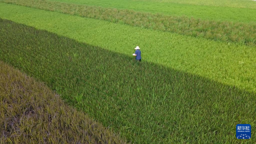8月22日,安徽小崗種業科技有限公司科研人員傅先來在試驗田里查看水稻長勢(無人機照片)。據介紹,這家公司主要致力于水稻育種及產業化推廣。新華社記者 張端 攝