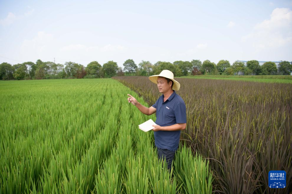 8月22日,安徽小崗種業科技有限公司科研人員傅先來在介紹試驗田里的水稻品種。新華社記者 張端 攝