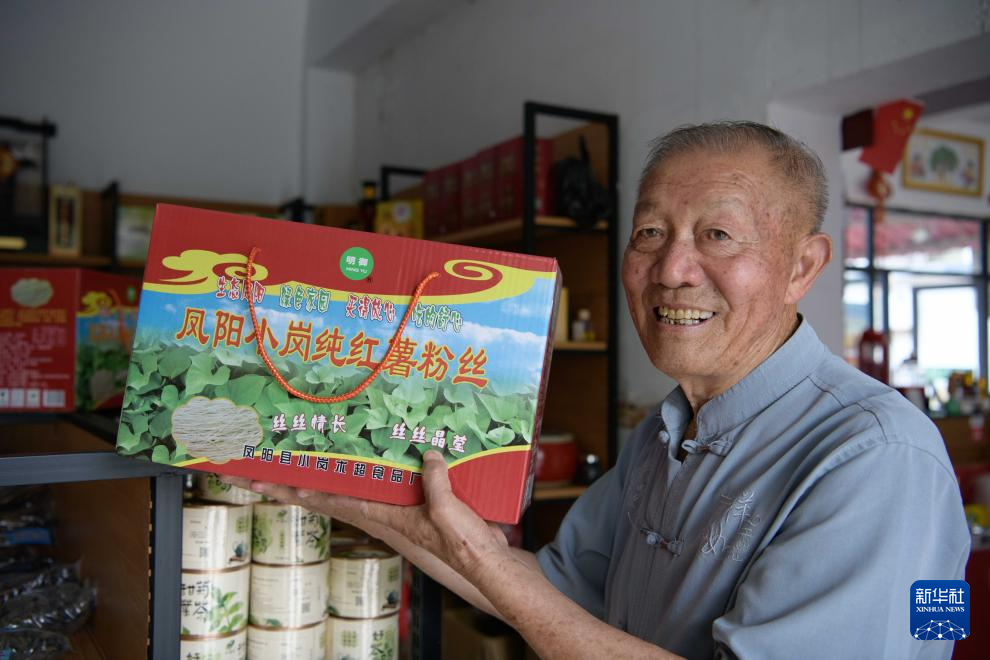 8月22日,小崗村“大包干”帶頭人嚴金昌在自家開辦的農家樂里展示小崗村特色農產品。新華社記者 張端 攝