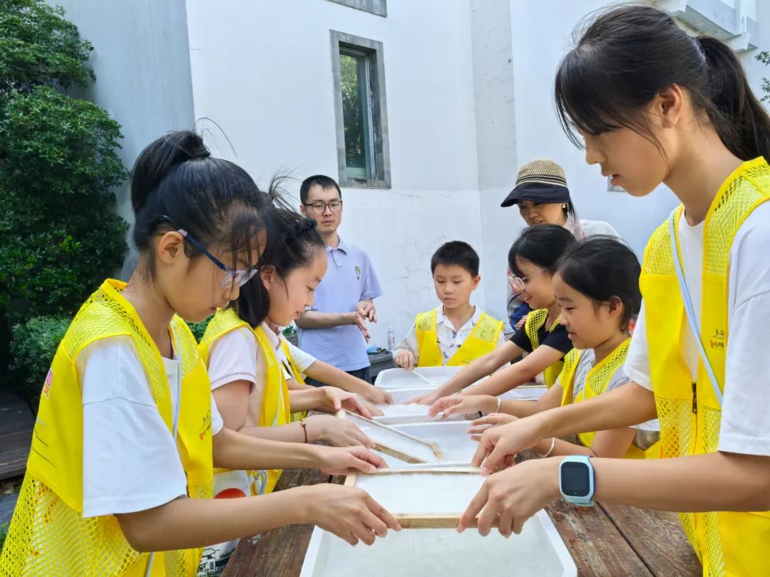 午后的“非遺工坊”里,孩子們圍在老師身旁,認真學習“徽州古法造紙技藝”。紙漿、抄紙簾、水桶、模具……這些看似尋常的材料工具,在小手中變成了造紙的“法寶”。在工作人員的耐心指導下,大家有條不紊地完成攪拌紙漿、抄紙簾撈漿、擠壓、晾曬等工序,親手復刻這項流傳千年的技藝。